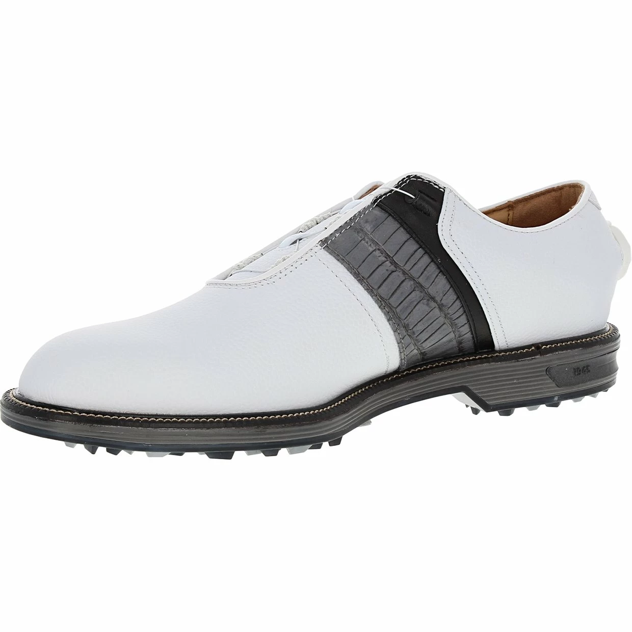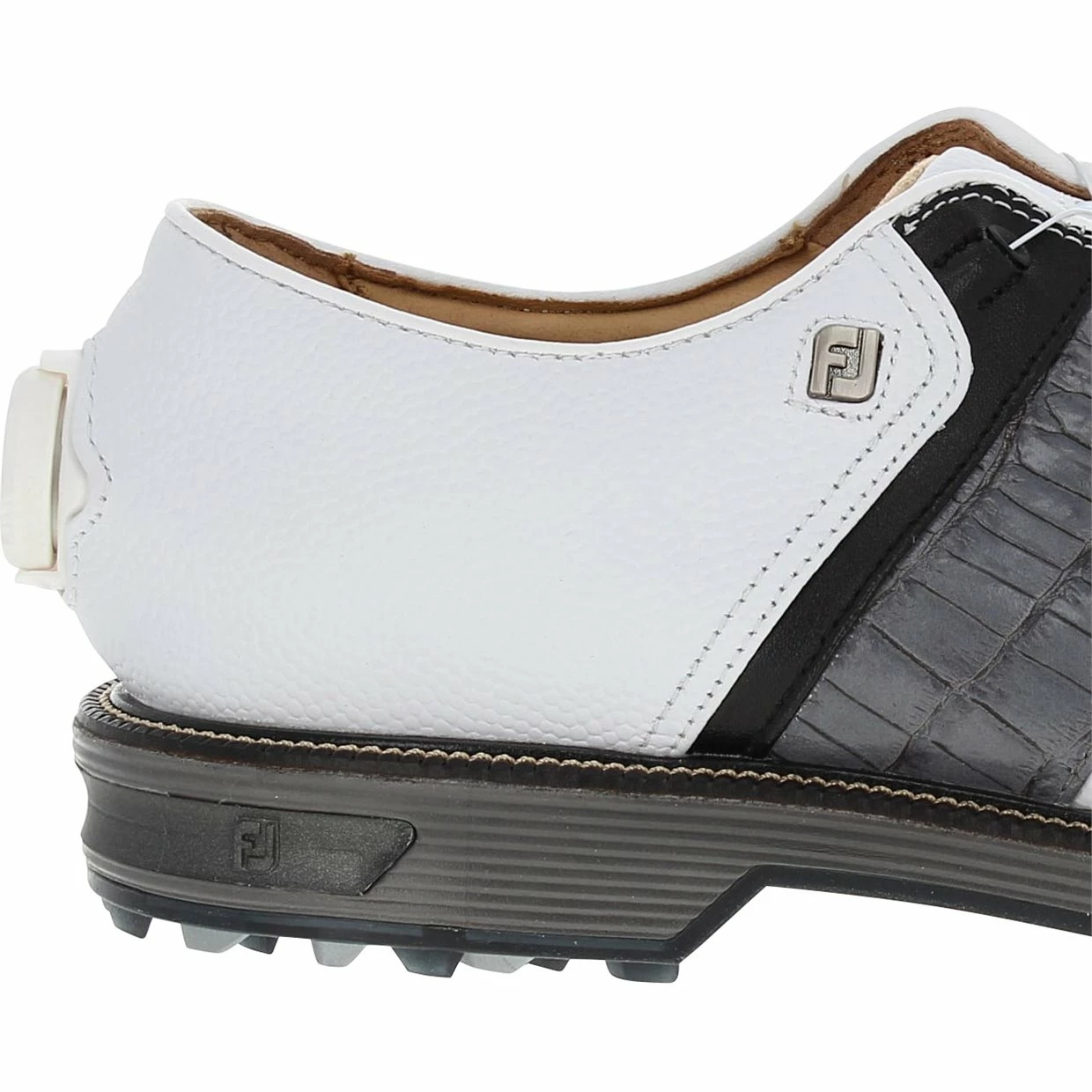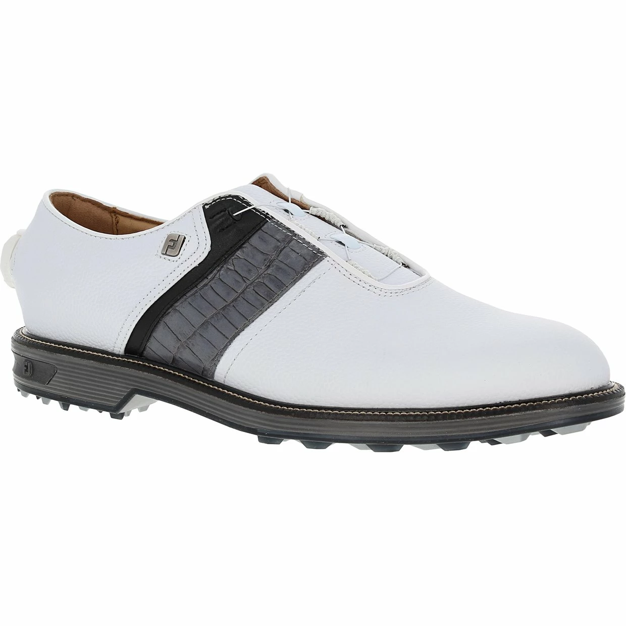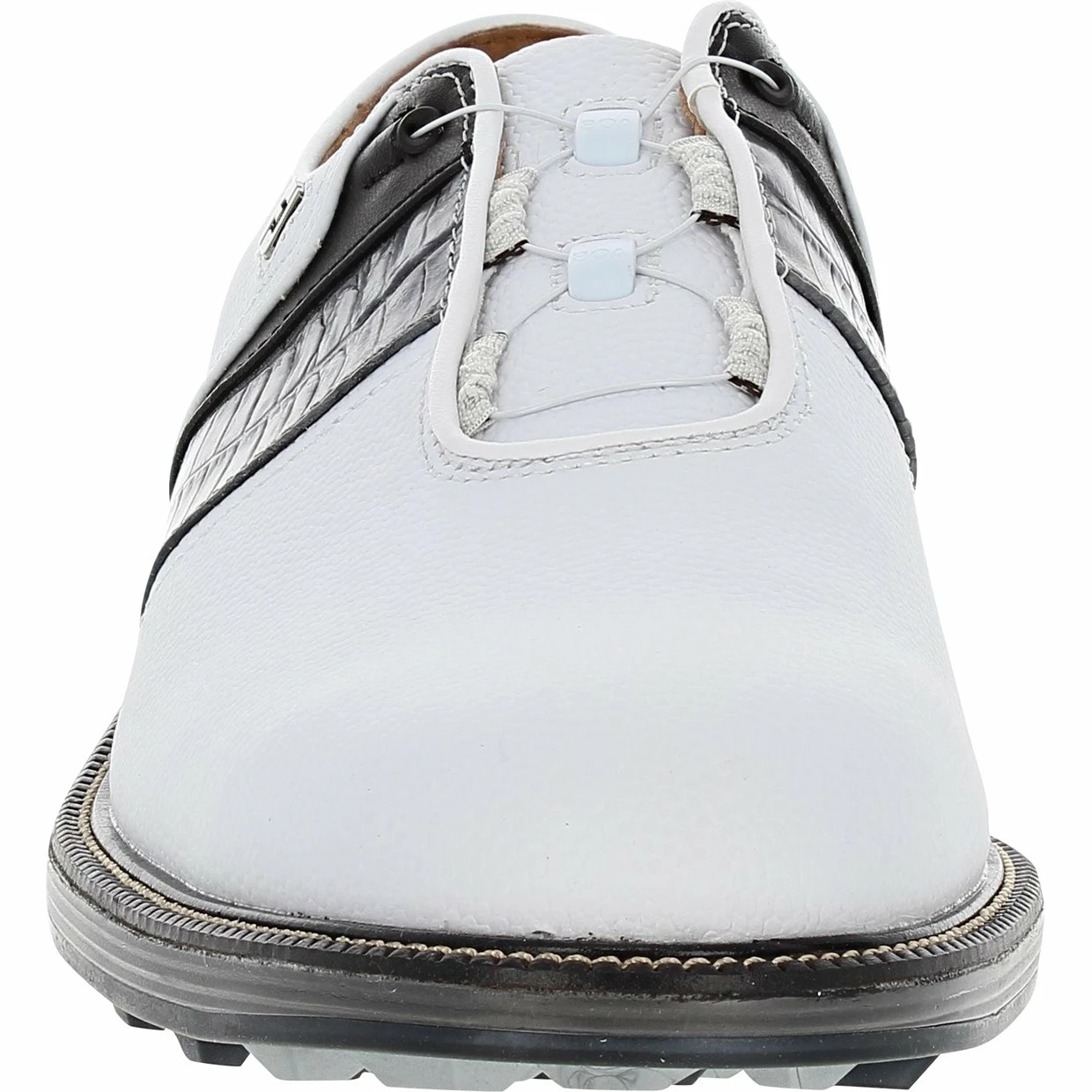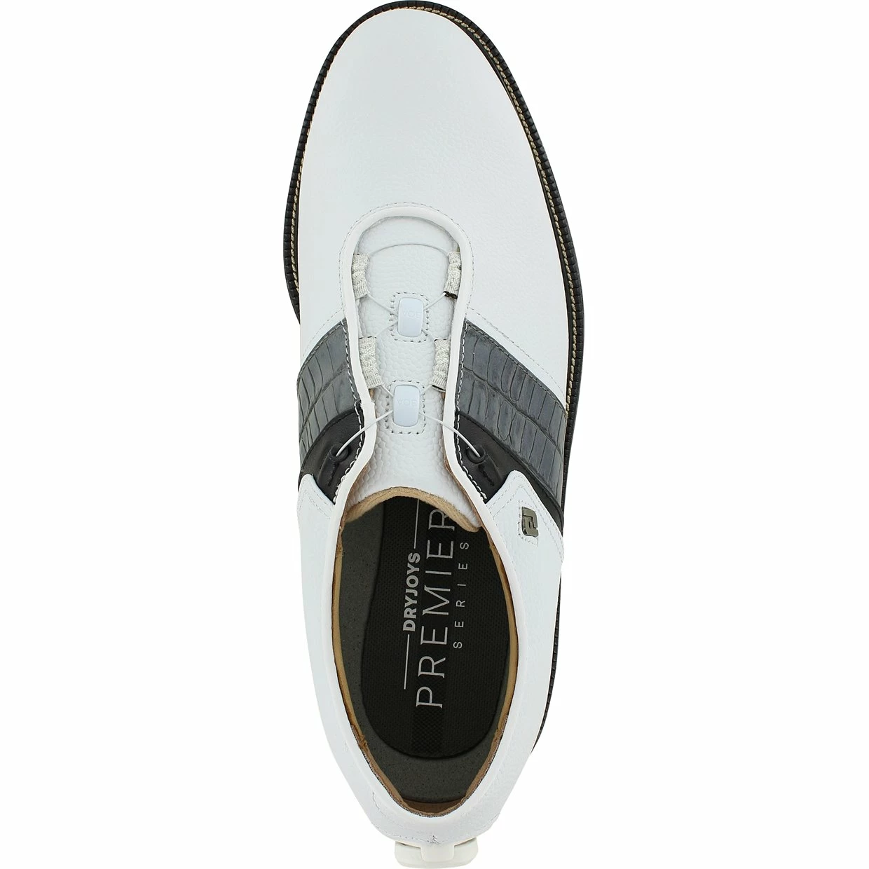The FootJoy Premiere Series Packard BOA spikeless golf shoe offers exquisite detailing, representing classic styling. It is constructed with a soft, supple premium leather upper, offering ultra-lightweight comfort. The upper provides water protection and features the BOA fit lacing system. BOA delivers a precision, dialed-in fit while alleviating pressure points at the top foot. Packard also features an Othrolite EcoPlush FitBed that provides perimeter stability in the heel, as well as super-soft and comfortable underfoot cushioning. In addition, the VersaTrax+ outsole is designed with revolutionary tread pattern that provides exceptional traction for hard and soft surfaces.
