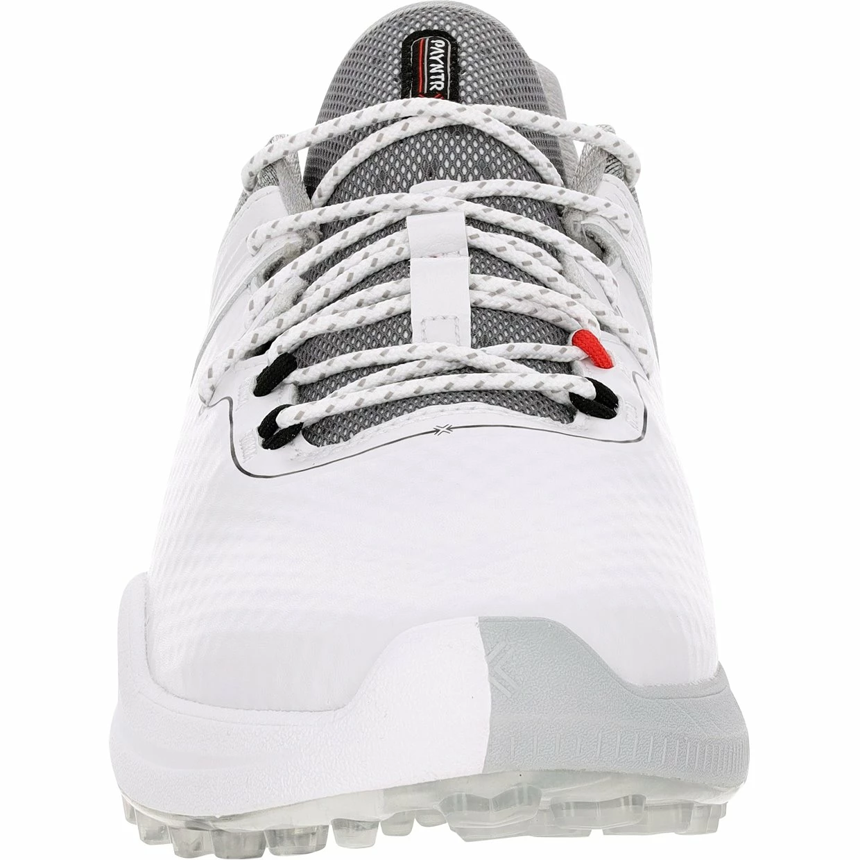 The PAYNTR X 001 provides holistic comfort and performance traction built for golf. The three dimensional traction provides golfers the ability to better control linear motion, resist rotational movement, and more effectively harness vertical ground forces. Soft & responsive under foot cushioning with a PMX Foam midsole delivers on-course comfort and zonal-specific support for the golf swing. The lightweight, flexible, & breathable upper includes a vented tongue to move perspiration away from the foot for an optimal in-shoe environment. The upper is treated with a super hydrophobic NeverWet solution to provide a waterproof finish. The articulated TPU outsole and dual density midsole houses a lightweight responsive graphite power plate, delivering maximum energy return to more effectively generate ground reaction force.