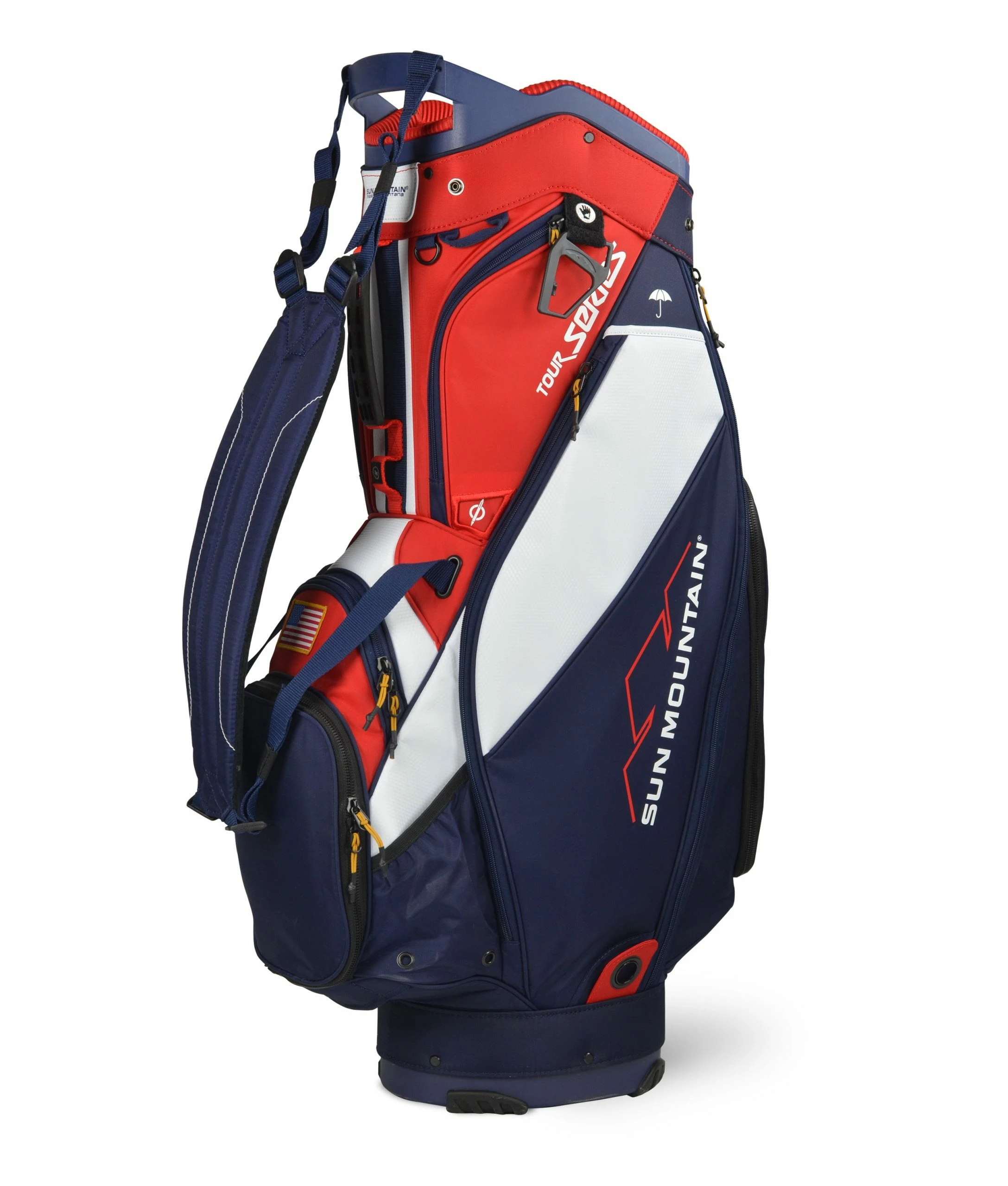 A full-sized, full-featured cart bag, the Tour Series is designed for riding and push cart use. Tour Series has more traditional cart bag styling, is constructed with a combination of nylon and vinyl fabrics and has ten pockets available to organize your gear. Its spacious, four-way top with full-length dividers makes pulling clubs easy.